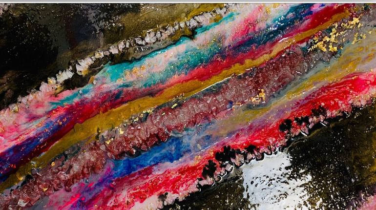 This abstract expressionist piece is a vibrant exploration of nature's beauty. Inspired by a crystal-clear stream flowing through a colorful canyon, the painting features a mesmerizing interplay of colors, textures, and shapes. The use of resin, acrylic paints, and ink creates a captivating depth an...