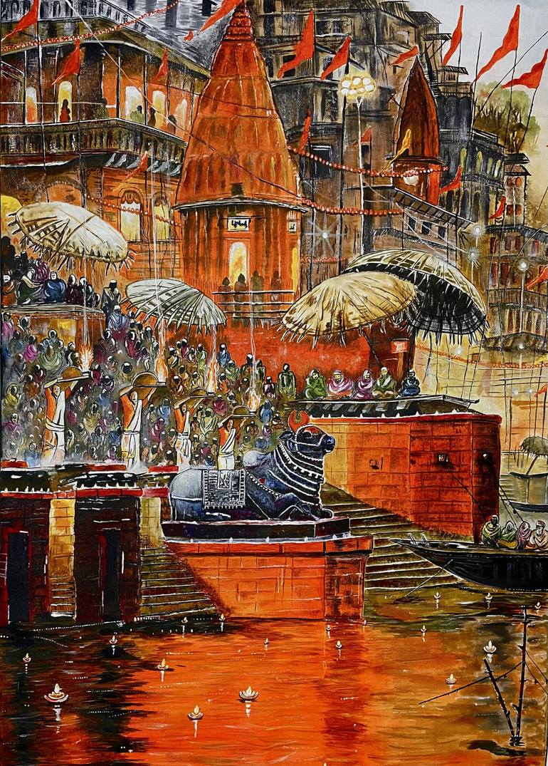 "Resplendent in Ganga Aarti" captures the timeless ritual along the banks of the sacred Ganges. In this 42x30 inch acrylic on canvas masterpiece, the scene unfolds with a harmonious blend of chaos and serenity. At the forefront, Nandi, the celestial bull and symbol of devotion, sits in tranquil reve...