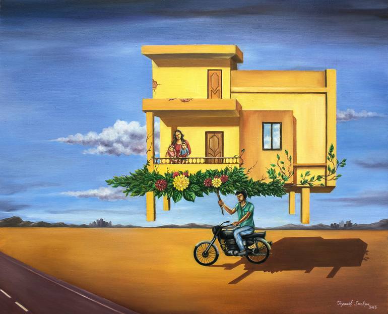 My new born twins baby inspired me to do this work. Viewers will feel that a man carrying a house on his head.Generally father carry all financial responsibility of their family.I felt this situation when my twins baby born. I choose oil on stretched canvas,Color-Camlin Kokuyo(Brand) Canvas-Arfina(B...