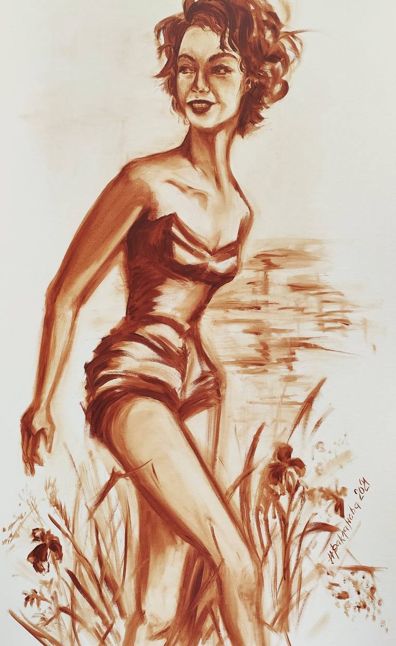 Sweet Memories Retro Style Original Monochrome painting Portrait of Young Woman in a swimsuit on the riverside Figurative art Sepia Colour Beauty Girl portrait Romantic Wall Art Living Room Decor 2021 Original oil painting on cotton canvas with wide edges Signed Ready to hang Size 19,8x31,5 inch...