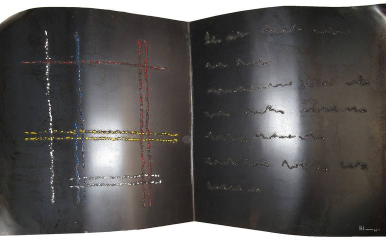 This is the first work of the series of "Revelations". They are books of knowledge made in metal sheet shaped. The illustrations are realised with a series of welding points. It's possible to hang it on a wall or put it on a base.