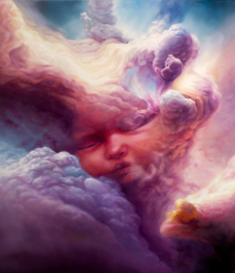 A painting from a series inspired by nebulae and figurative motifs.