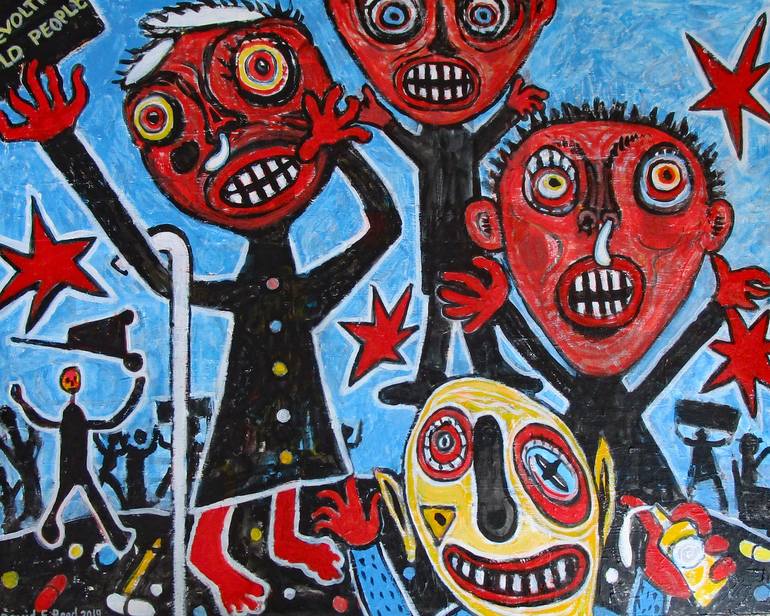 The title is a play on words old people are rioting or we don't like old people and their snotty noses. Well, they are rebelling in this picture and no mistake. The humour is there in this work and this is its appeal. Stand up for the elderly they have earned your respect. I lke the bold colours a...