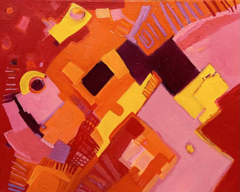 A fun expressive painting on canvas with acrylic paint. This painting can be hung vertically or horizontally. A celebration of pattern, harmony, and contrast, where warm colors become sound and form --a beat. The composition unfolds like a dance, shifting between tension and release. For more day...