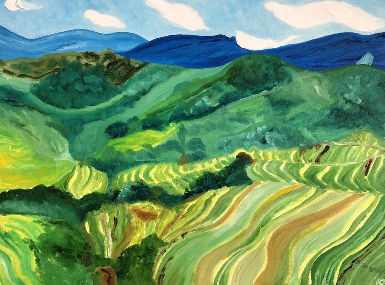 This original landscape oil painting is inspired by the beautiful views of Longji Rice Terrace Field in China.