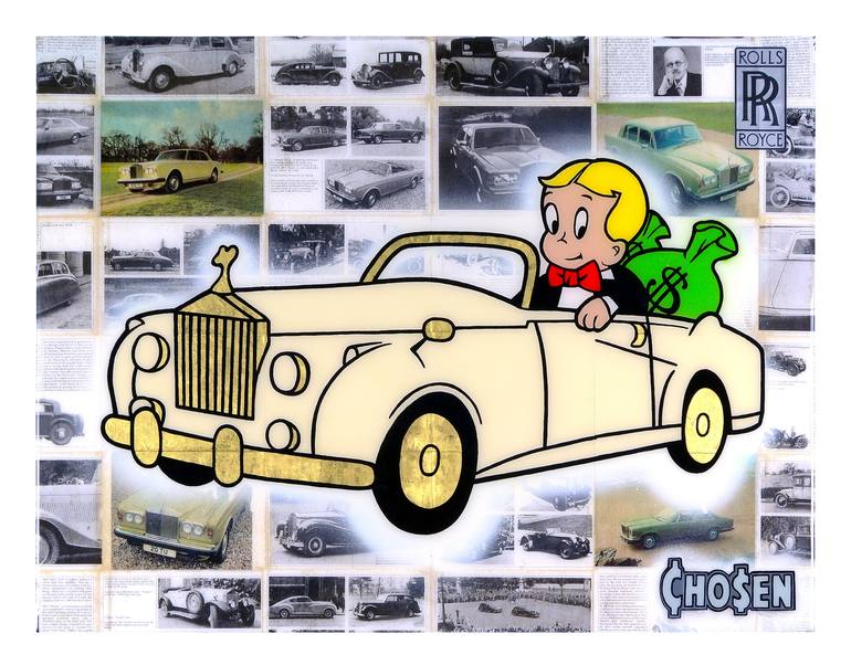 Original mixed media painting. Acrylic, spray paint, 24K gold, vintage Rolls Royce book, resin finish.