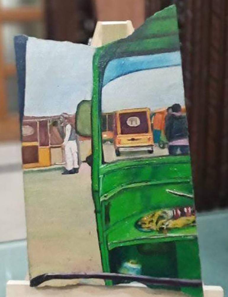 "As dusk descends on Lahore's streets, A lone rickshaw glides, its colors sweet, A fleeting glimpse of beauty, in the fading light's treat." The painting is created on a marble stone with irregularly shaped corners. It will be delivered with its miniature stand, allowing you to effortlessly showcase...