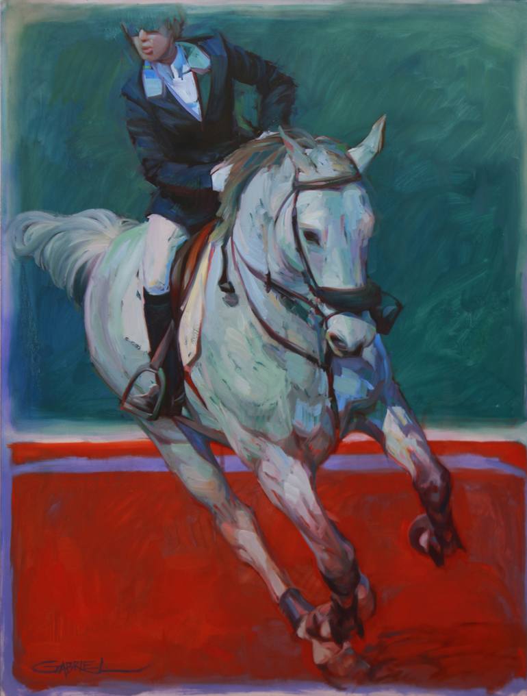 Equestrian grace galloping past one of the great modernist backgrounds of our time. - oil on triple primed and toned mediate panel -