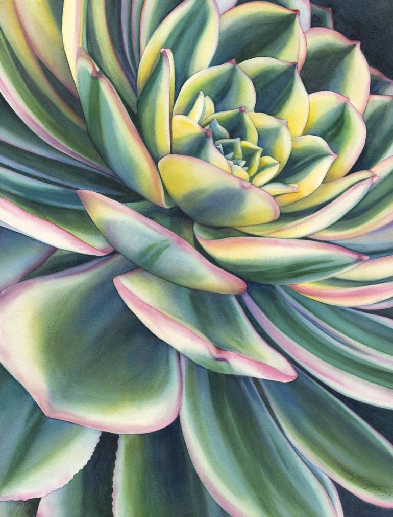 I was just moving out of a phase of painting my "Persistence of Pink" show of macro views of primarily pink flowers. The rich greens and yellow striping of this blooming plant with its touch of pink was a good transition to a new set of paintings. That new direction became a series of large succulen...