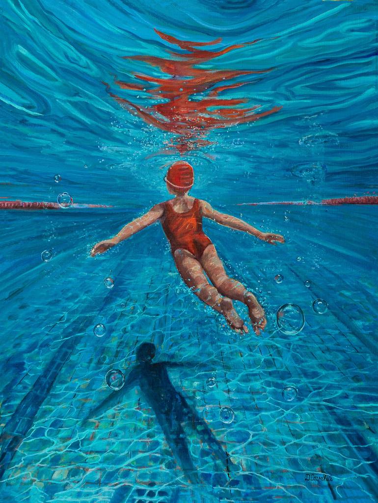 Rise to the Light Rise to the Light is a striking original oil painting that captures the serene yet powerful ascent of a swimmer toward the surface of a sunlit pool. Created on high-quality linen canvas (18x24 inches or 46x61 cm), this artwork celebrates themes of resilience, hope, and self-discove...