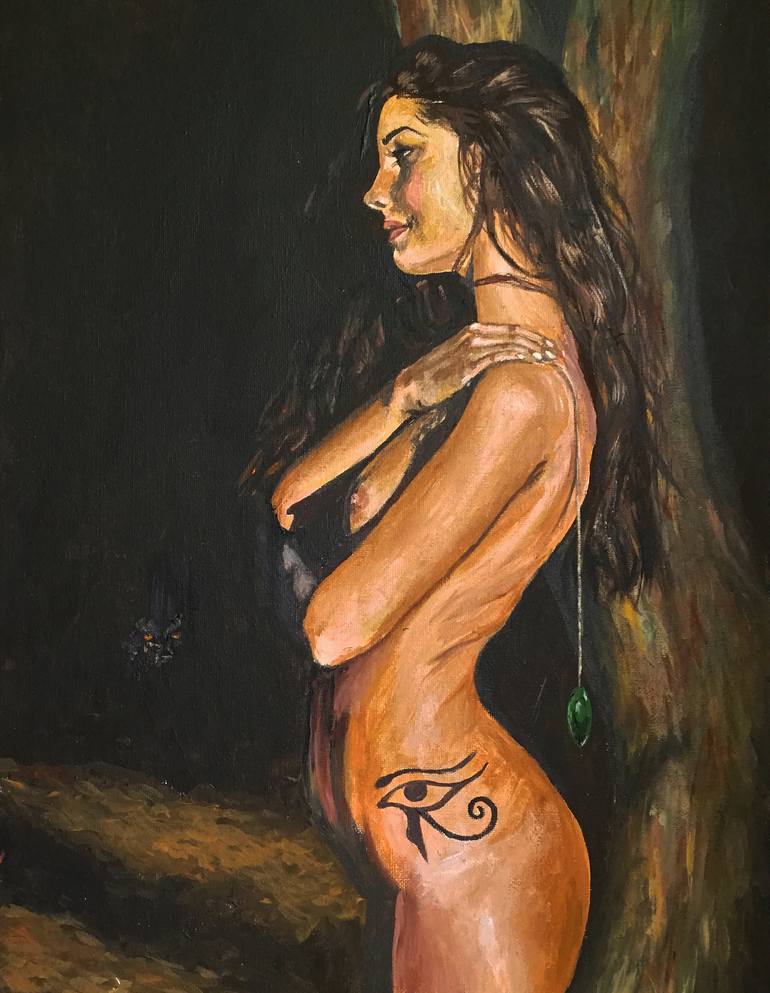 A young woman in a forest at nighttime. She’s has the protective eye of Horus tattoo on her hip and is holding a peridot pendant for strength. There’s the faint hint of a wolf lurking in the shadows, but whether friend or foe is up to interpretation. What do you think?