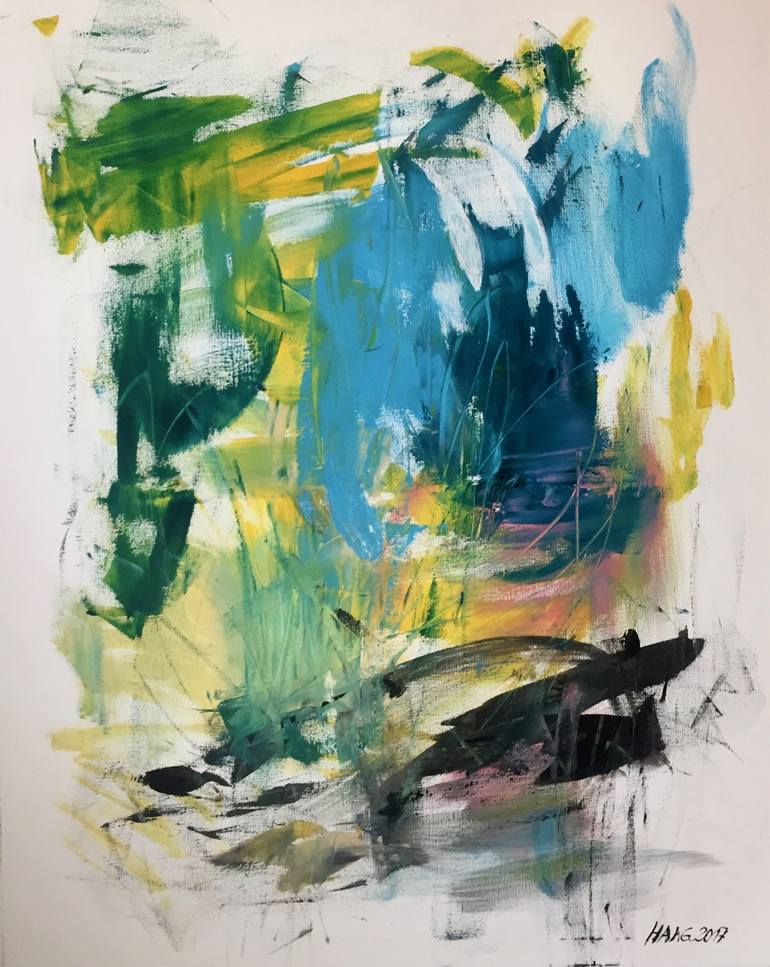 "River Head" is inspired by a walk in the Bavarian Forrest. The nature there was quite unspoiled and beautiful. It had been a lovely and very enjoyable day. Back in Munich I started to paint "River Head", full of the impressions of this beautiful day. The sides of my painting are left white. It i...