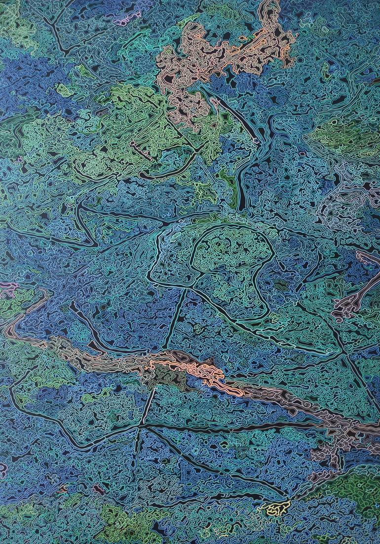 An original painting due to a particular technique, the color is applied with bottles filled with acrylic paint. Each color was created individually. The eye combines all the lines and creates an entire picture. The impression is that of a moving image. Everything comes to life. The painting is sign...