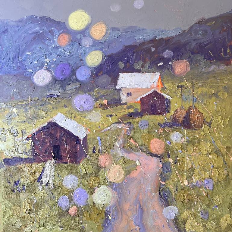 The artwork portrays a scenic view of a road, village houses, and serene blue mountains nestled in the heart of the Ukrainian Carpathians. It is a nostalgic representation of the artist's joyful memories from this enchanting region. The Ukrainian Carpathians offer an unrivaled symphony of nature's ...