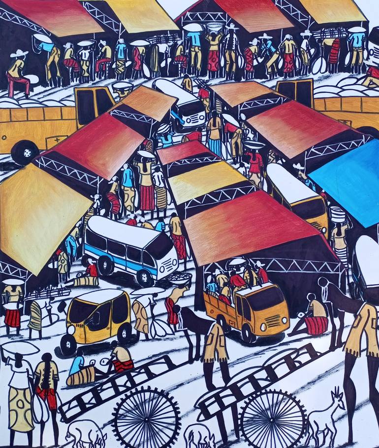ROAD TRANSPORT PAINTING You can see passengers gathered in bus station. Buses, bicycles... This is a reality, across Afro countries... Very beautiful painting with special style ( orange, yellow, black, white, blue colors, geometric shapes...) - Original acrylic painting - Large painting - Heigh...