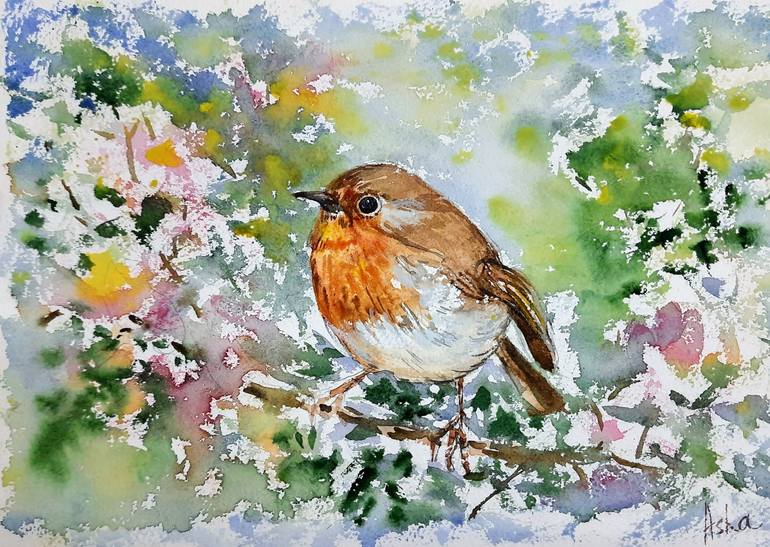 A cute robin in the foliage. Under the sky, enjoying fresh air and the sweet fragrance of the surrounding flora and foliage! I love nature and the birds and animals! Watercolours on textured 270gsm handmade paper. Size : 11.75"x 8.25" (unframed) Mat/mount/frame as in virtual in-context images are n...