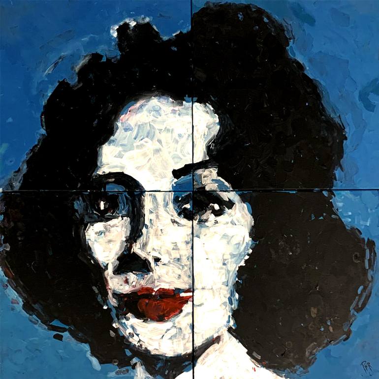 "Robotic Liz Taylor" is a stunning composite artwork created by a collaboration between a robot and its human partner. The piece features a bold portrait of the iconic actress Elizabeth Taylor, painted on a vivid blue background with dynamic and expressive strokes. The composite canvas consists of ...