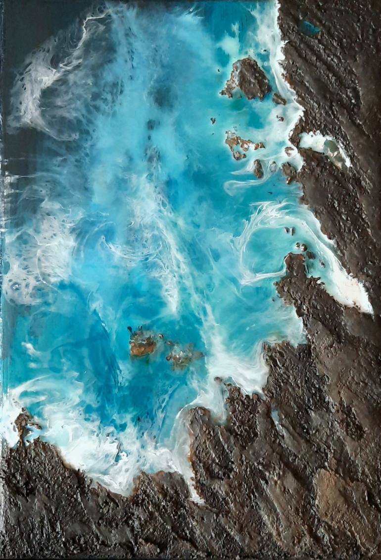The rocky shore attracts attention with its mystical beauty. The painting tells us that the nature is not joking, it points to a struggle for survival.