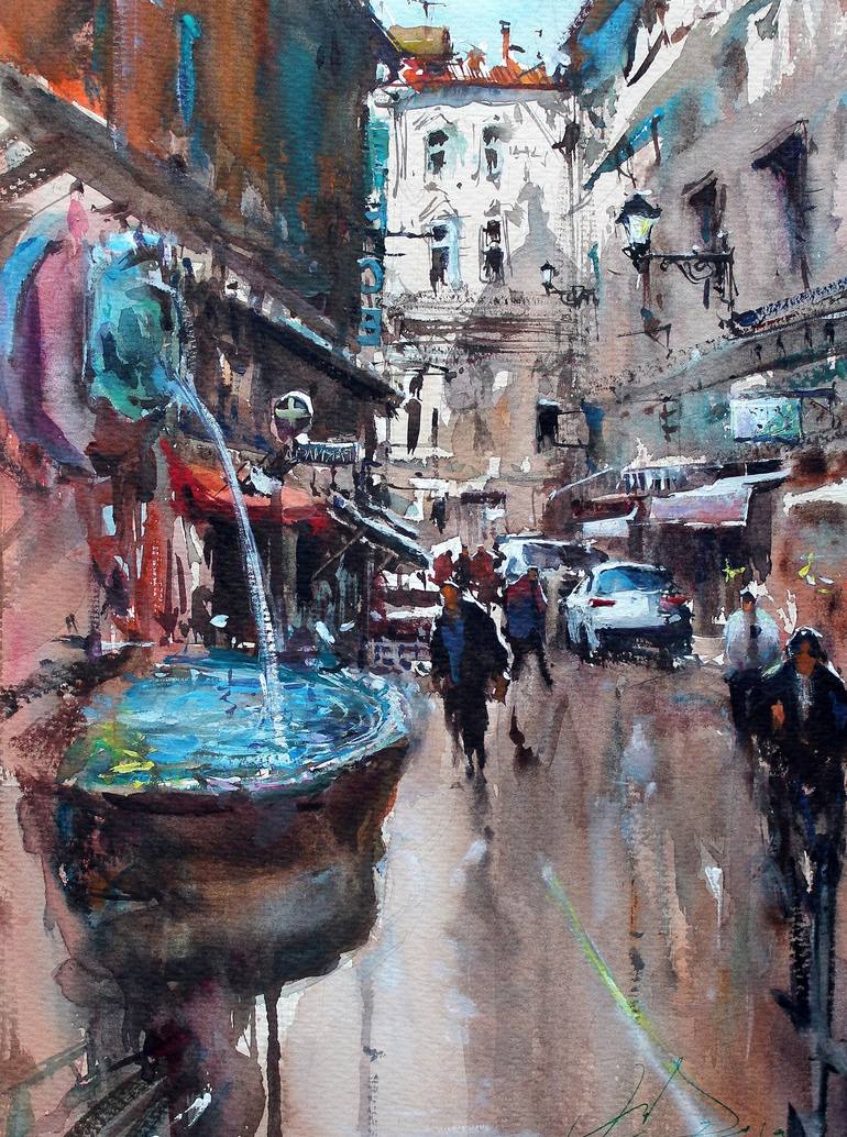 STATEMENT: Italian watercolorist Maximilian Damico paints primarily on location. He observes city sidewalks and intersections, looking for not the most famous scenes but the most interesting. With quick, lively brushstrokes, Maximilian captures the energy and mood of cities whether in the rain, gloom, or rush hour. The frenetic quality of city life doesn’t detract from the beauty of each scene. Maximilian’s gestural technique instead infuses liveliness in each artwork, a liveliness that makes being in a big city a never-ending thrill. PROCESS: I usually work on location, just sometimes I do several sketches of the same theme and then I go to complete it in the studio...usually I do finish a painting one going on (this is essential in my technique). I do not mind about famous sight seen, but I like walk in some place to find an aesthetic details or an interesting game shadow/light. Basically I approach the painting with a separate palette warm and cold colour, the contrast lets have an interesting three-dimensional and plastic effect; I try every time to move the brush as fast as I can, to catch the movement, that I am seeing in reality, on the paper...that lets the painting get the energy and the vibrations that I am constantly looking for in my style; I can use a very wet paper and brush full of water sometimes I use very dry colour......I never use very tiny size brushes for small details...but I am interested in the big block of masses, their contrast make the beauty in a painting. BIO: I was born in south Italy, and took courses of painting in Academy of Fine Arts in Naples; after the Fine Art 'Diploma', I left south Italy to have broader contact with the international Art scene, following different routes: as Barcelona, London, Paris, New York and Prague: where I maturated my own style made by semi abstract elements and expressionist executions and techniques. I spent 5 years in this kind of wandering life, always looking for areas of visibility, collaboration and contracts with Art Galleries. Meanwhile I was achieving and accomplishing a good number of success and desires, has grown in me the germ of dissatisfaction: an awful virus in a mind of an Artist. For this reason I went back to my own village in Italy on Amalfi Coast, to dig in myself: where after a while , for joke, I applied for a watercolour art contest .