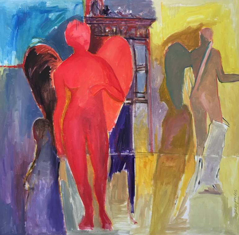 oil on heavy duty canvas; needs frame or stretching to hang; Impressions form my 2017 visit to Italy - this statue in the Vatican was in the middle of a mirrored room which put all of us in my photos. The reflected white marble hunter and mostly white room was like a blank canvas which is colored i...