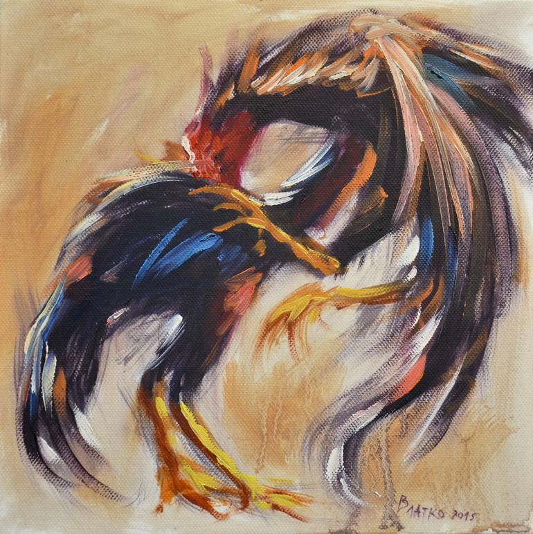 Rooster fight (part of poliptych of 25 small paintings composed in one big picture). Available for sell as separate pieces, but also as whole poliptych of 25 pieces. Painted in expressive manner, with impressionistic colors and strokes. Part of series of paintings with rooster fights. High contrast,...