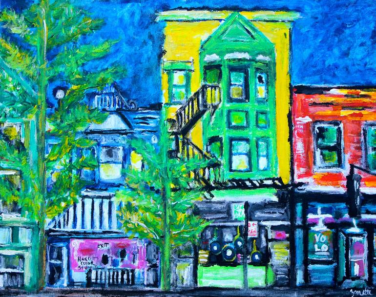 Painting of one of my favorite streets in Chicago, Roscoe Street. Here I painted a beauty shop, record album store and wine shop.