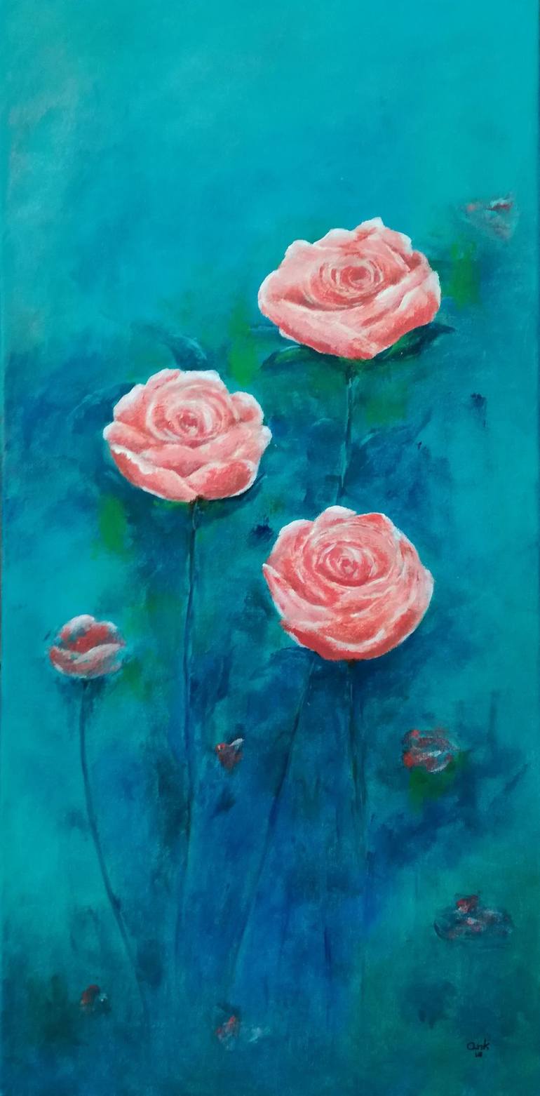 Expressionism acrylic painting of light red roses on a blue/green background. I always love to paint flowers, they belong in nature.
