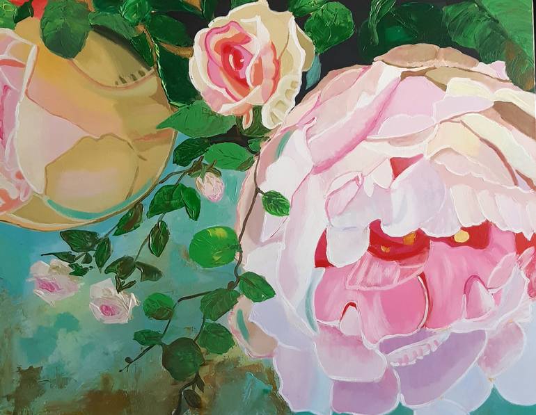 Pink Peonies Painting. This a acrylic painting on canvas. Pastel colors flow from one color to another. The golden lines are reminiscent of sunlight. The sides of the painting are painted gold. Great gift for mother's day. The painting is sent on a roll. Size: 32'×26" inches (81×65 cm) If you want...