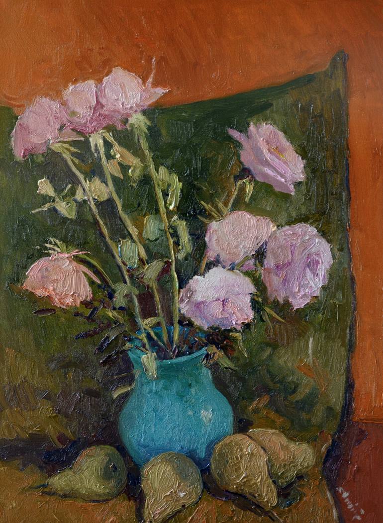 Soft, Pink Roses on the olive green background with Pears together look positive, full of beauty and harmonic. Impasto textured brushstrokes give a dynamic, fresh sense to the artwork. The painting is on gallery-wrapped canvas. The sides are painted. it has a wire to be displayed even with no frame.