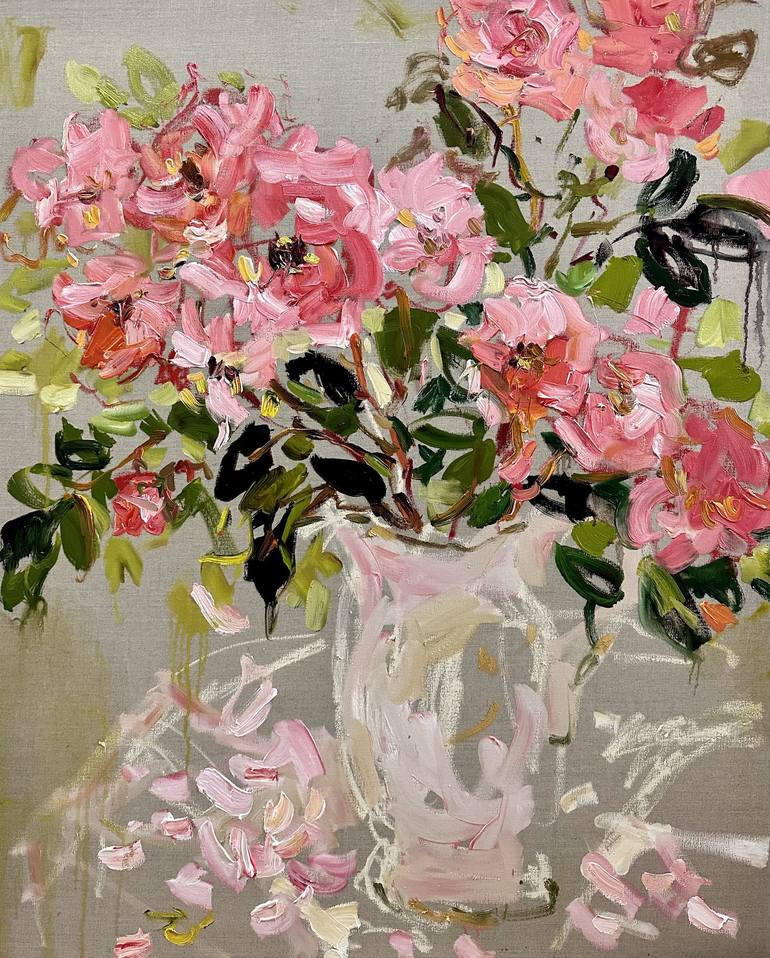 An expressive and gestural floral still life painting. Roses from my garden in a white jug. Oil on linen 100x80cm.