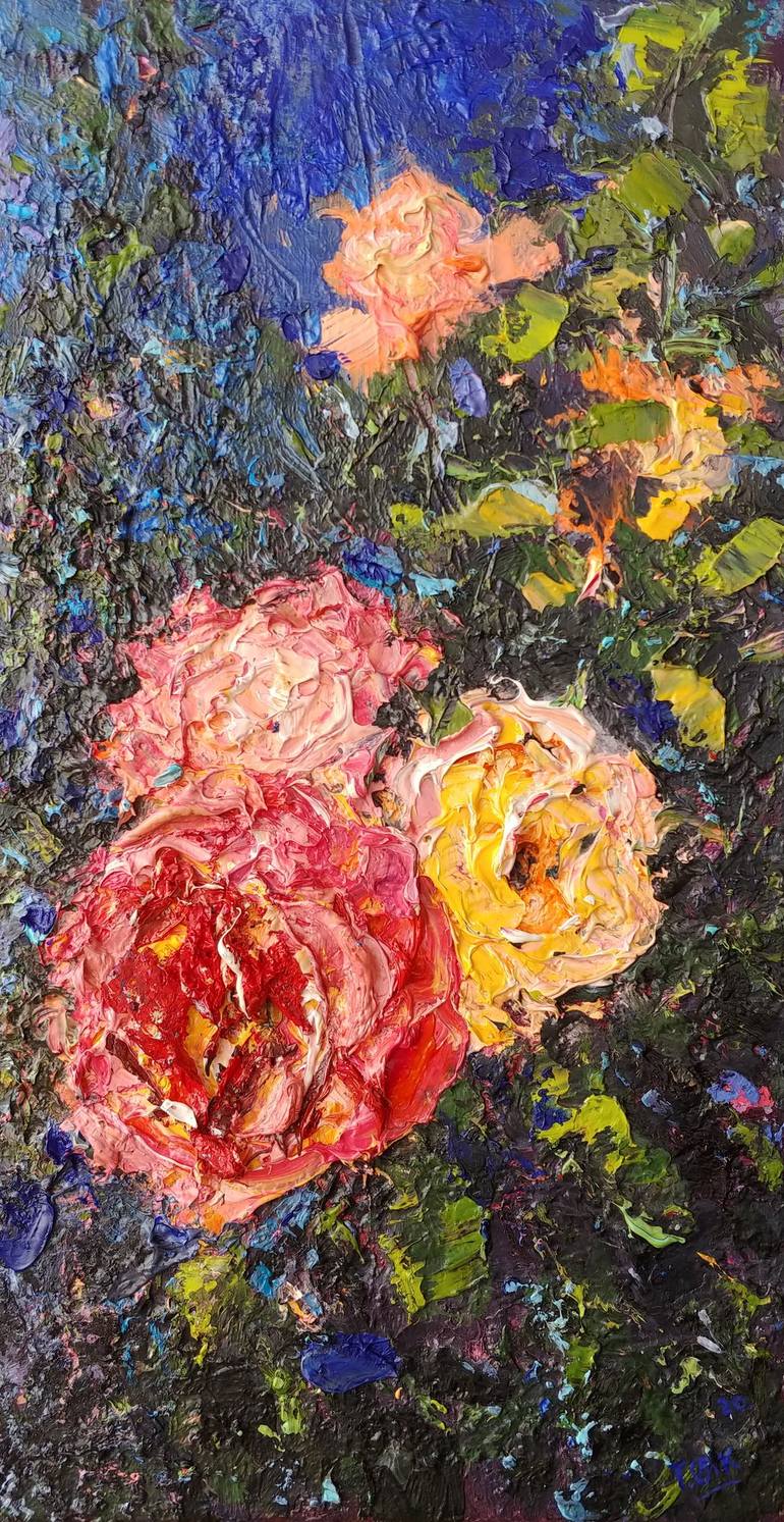 Original oil painting full of rich and yummy textures by artist Olena Tymoshchuk "Roses in the night" 35 X 18 cm Canvas, oil Signed on the front and back Dated 2020 Beautiful roses inspired me to write this work. An original painting will bring an amazing atmosphere to your space. The painting is...