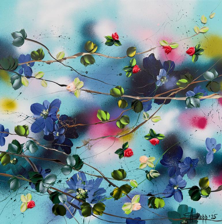"Look at a tree, a flower, a plant. Let your awareness rest upon it. How still they are, how deeply rooted in Being. Allow nature to teach you stillness." — Eckhart Tolle Roses on a Turquoise Sky (60x60x2 cm / 23,6x23,6x0.8 inches) is an exploration of modern impressionism, where texture and contra...