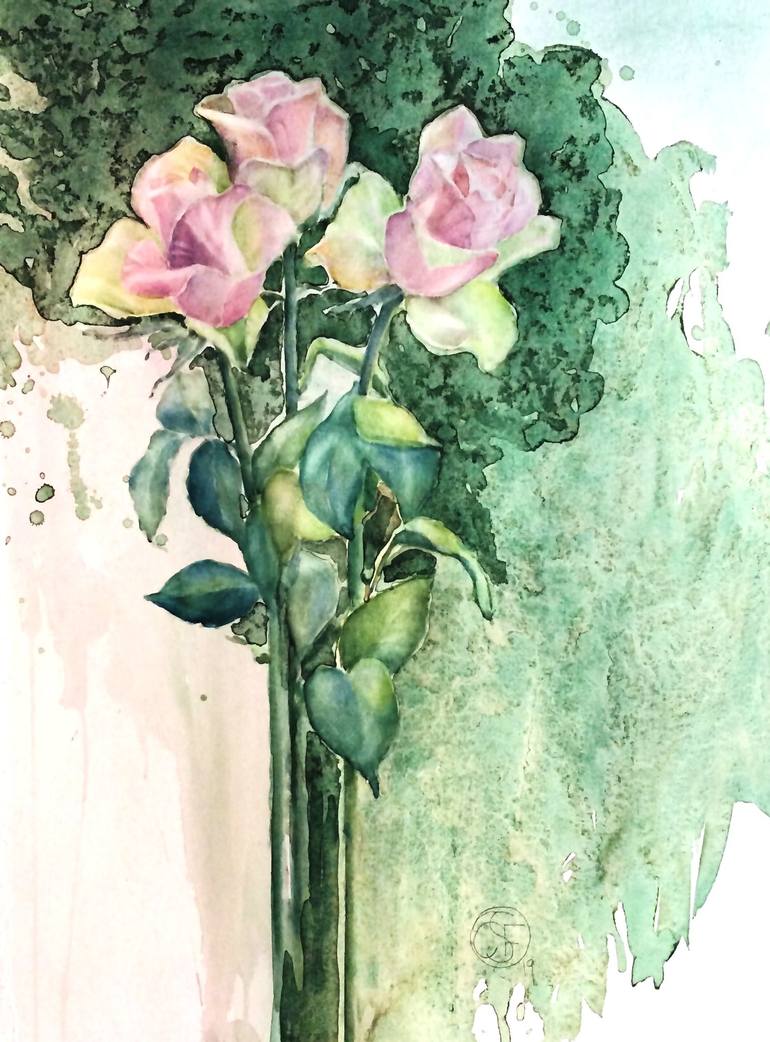 I painted this picture with three delicate roses with watercolour paints with great love. These flowers were given to me by my beloved husband. We have lived together for many years and he gives me flowers that I can't help but paint! Here the tenderness of flowers I emphasised with a complex backg...