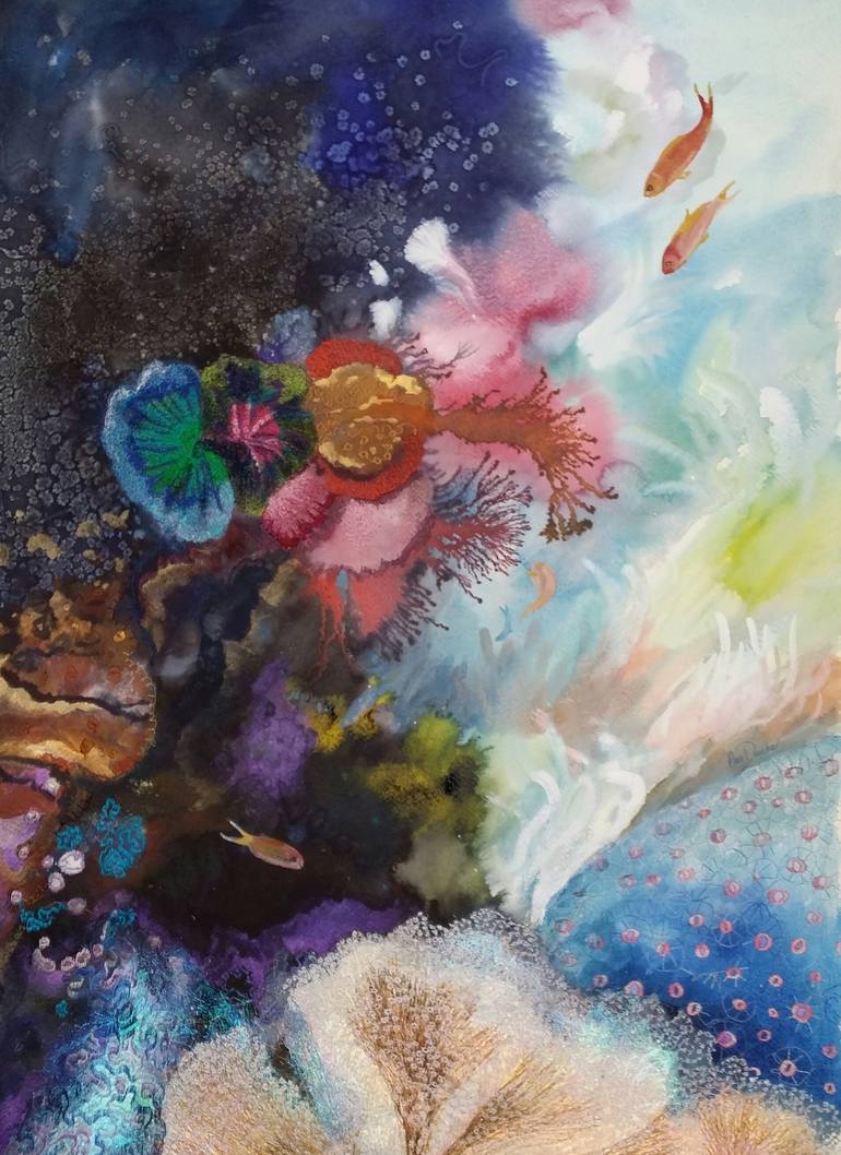 Painting is mounted in white acid free card dimension 70x100cm. Needs framing. Embroidery on paper, treated with archival mat, transparent varnish. Embroidery on paper which is treated at the back to keep in flat and to seal the stitching.