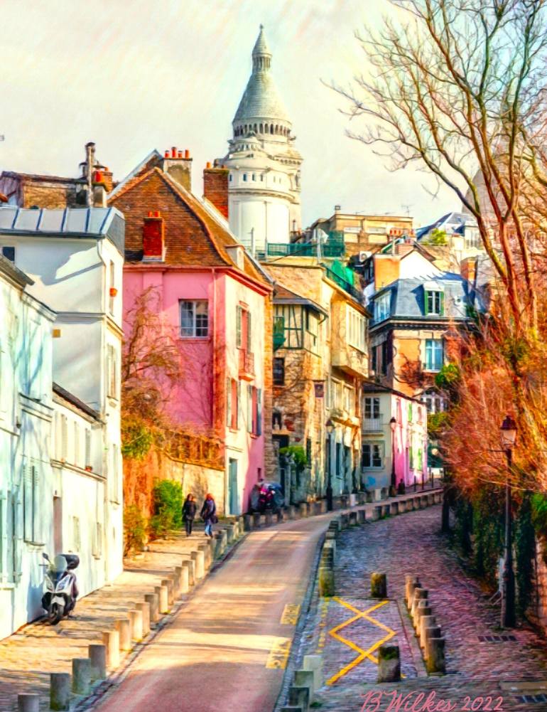 I’m a sucker for colorful streetscapes! In Montmartre, Paris, there are many pastel buildings from the Belle Epoque. Originally a path where livestock and draft animals from the quarries were driven for access to water (the water tower appears in this view), the road was scheduled for “urban renewal...