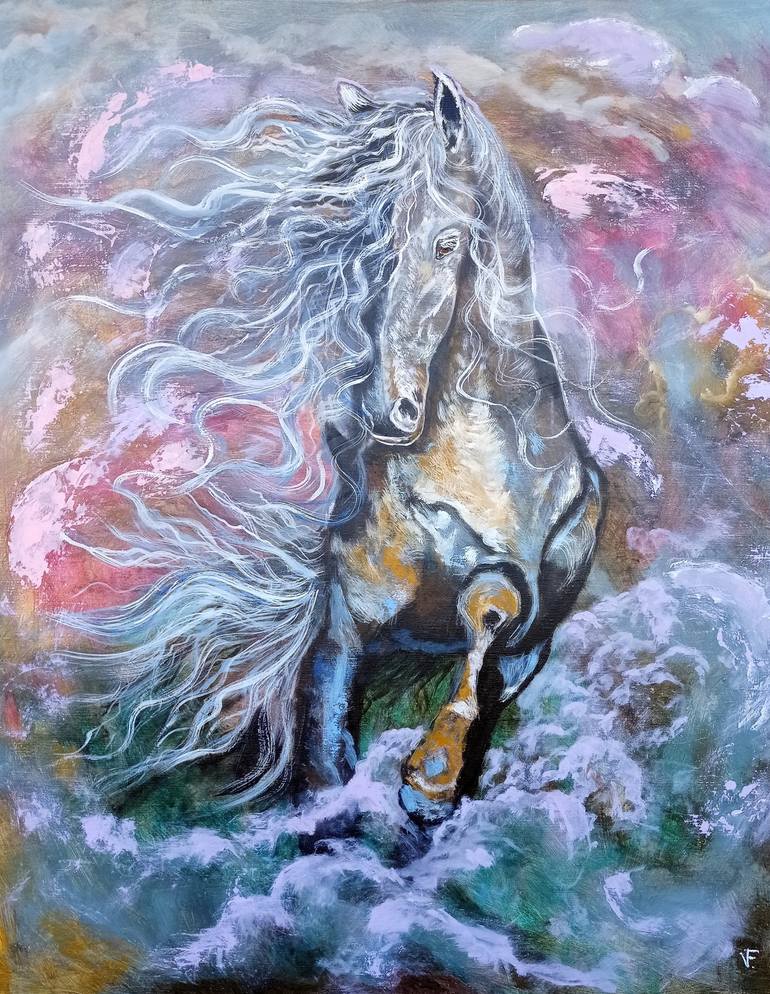 The Running Horse Original Painting Style: Impressionist Size: 80 x 100 cm Date: 2023 Video: https://youtube.com/shorts/nhVre1xGWZM?feature=share. Materials: acrylic and oil paints, canvas. The horse ran free with a white mane waving on the wind made with abstract style high-quality acrylic paint...
