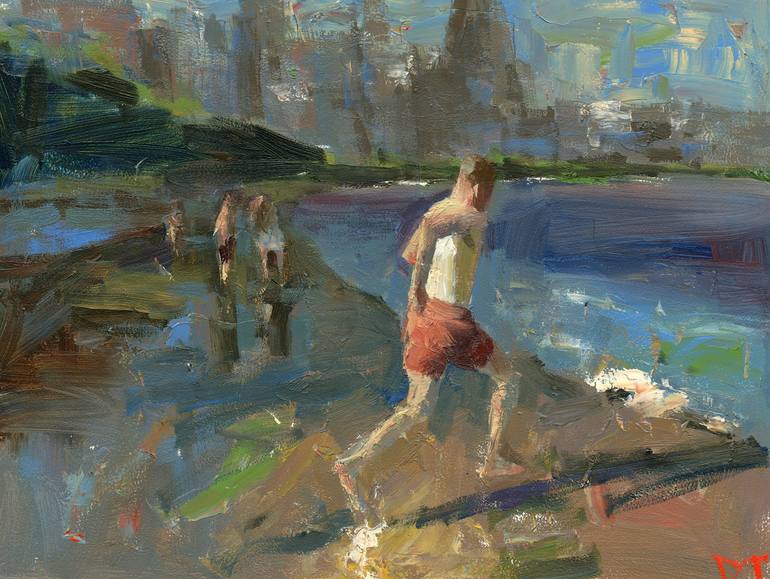 Running Man Lake Michigan is part of a series depicting vacations and leisure lifestyle.. I use subdued colors and loose brush strokes, as in most of my paintings, in order to create the mood and feel of spontaneity. Art buyers may see a symbolic reference to prominent 20th century American painters...