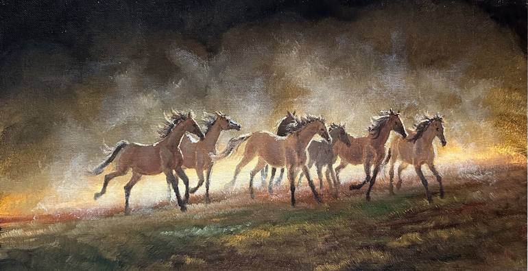 A herd of horses running in the endless steppe, sunset, the clatter of hooves, dry dust rising high into the dark sky, the long-awaited wind brings coolness after a hot day...