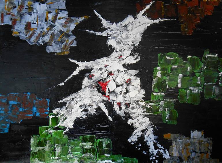 A tear in the fabric of the picture plane; the rupture may be the blackness, the expanding white mass, the red slashes, or all three.