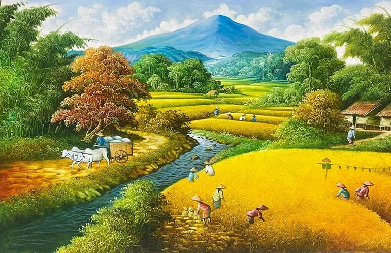 This stunning oil painting showcases a peaceful countryside scene that will add charm to any room. The large canvas is beautifully handmade with high-quality materials, and features a realistic and detailed landscape. The painting is unframed and measures 85 cm in height and 135 cm in width. The p...