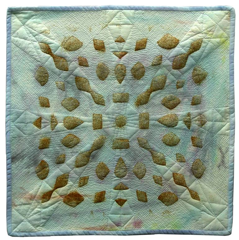 This series of textile artworks continues the exploration of rust pigmentation. Using the paper cutting technique for snowflakes from my youth, I devised a way to transfer the paper design onto my hand dyed fabric using iron filings. The tactile quality of the medium is maintained with this process....