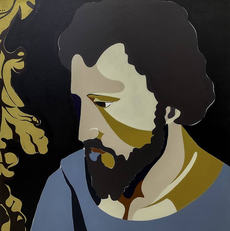 For this work I used one of my photos taken in the window of a Lisbon antique dealer. It is the portrait of a Saint Christopher in painted wood which sits alongside gilded baroque frames. Canvas signed and glossy varnished.
