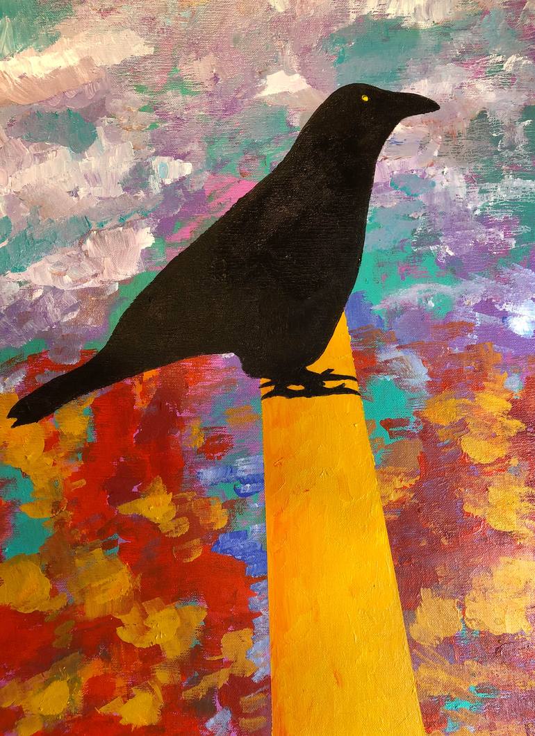 The Raven landed on our hotel balcony one recent trip to Saint Pete's Beach, Florida. He stayed there so long we figured he must be Posing for portrait -so I painted him! After decades of meticulous detail creating sculptures it was refreshing to loosen up with fast drying acrylics... What fun!