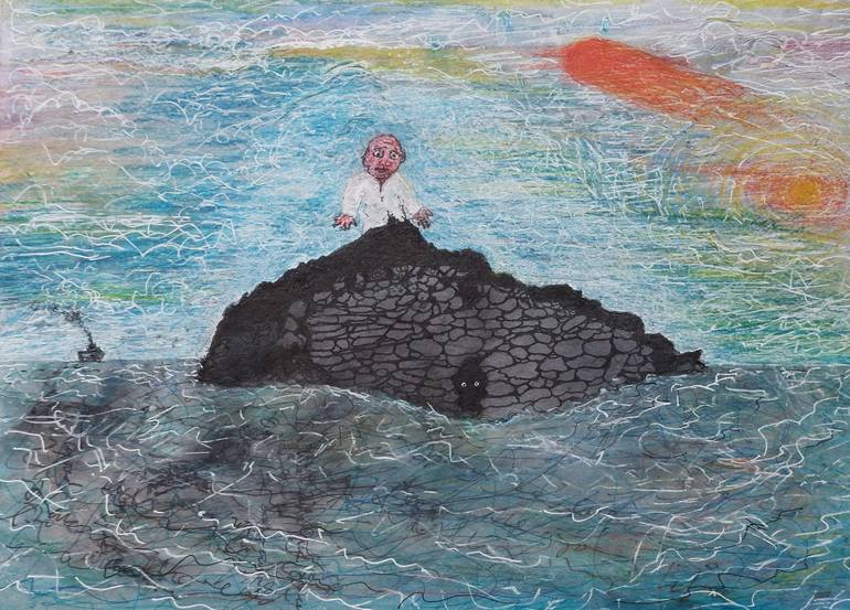 In this piece a man stands atop a rocky island in a hectic sea (and sky). Beneath him, from a black crack in the rocks, two eyes peer out. A comet burns its way through a restless sky. On the horizon a ship makes its way either to, or from (it's difficult to tell which), the rocky island. Is the sol...