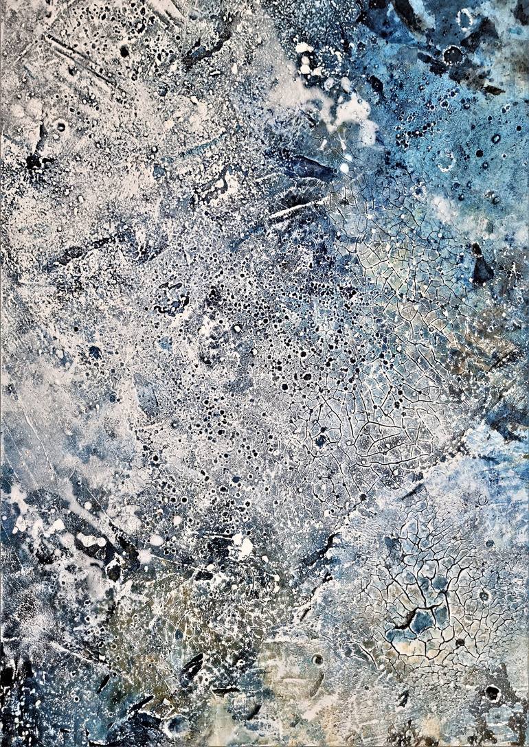 mixed-media painting with sands,acrylic colors and oil pastel on canvas, Inspiration: a cold and stormy winter day at the lake Colors: white, blue the work has an energetically refreshing vitalizing effect ready to hang titled and signed on the back with Certificate of authenticity