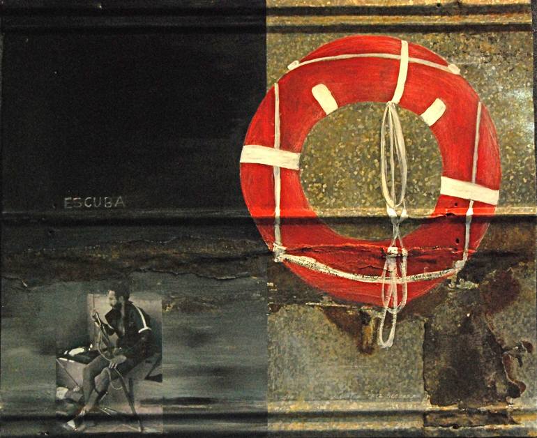 A play of words about Cuba and Scuba diving and Es Cuba, meaning in Spanish: This is Cuba. Image of Fidel Castro scuba diving places in a dark sea of grey paint. Acrylic, enamel, and collage on vintage barn metal roof panel. A red lifesaver on one side and text like chalk writing on a school chalkbo...