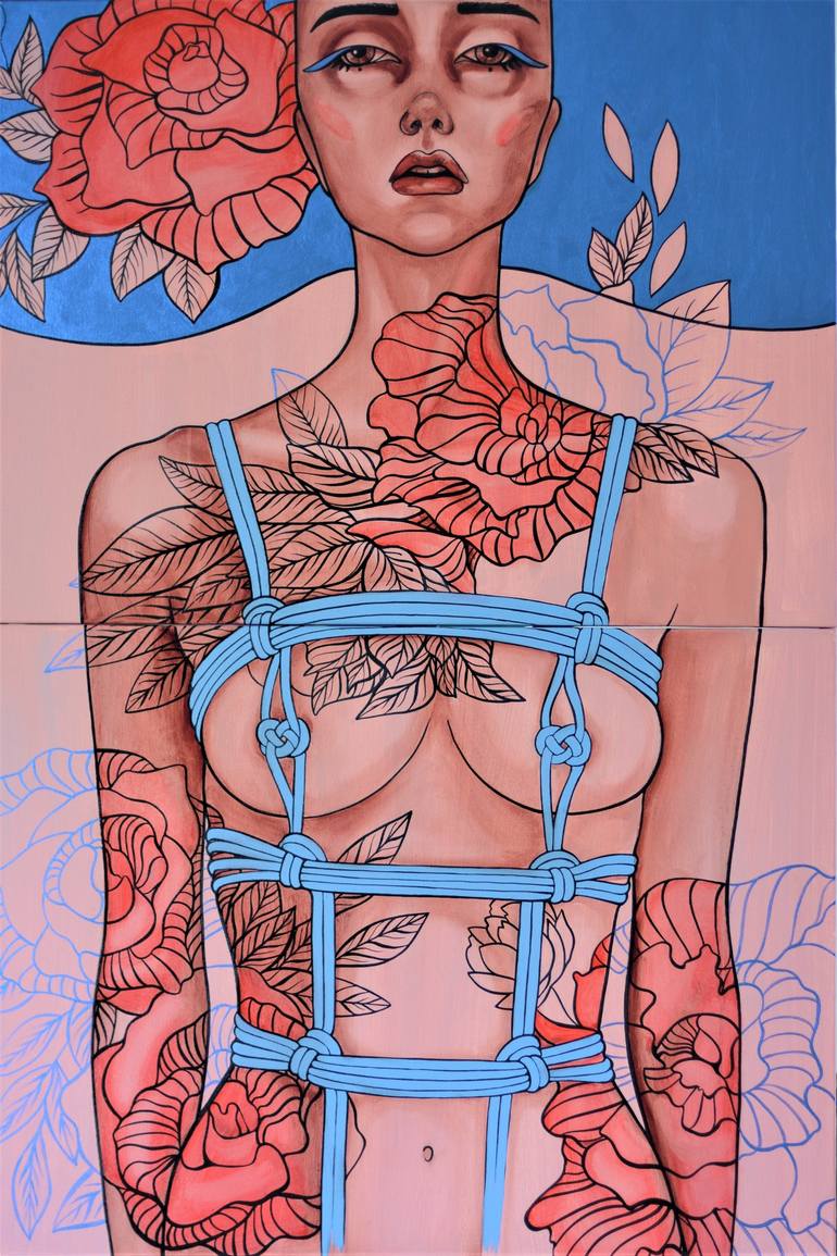 Kinbaku means "tight binding," while Kinbaku-bi literally means "the beauty of tight binding." Kinbaku is a Japanese style of bondage or BDSM which involves tying a person up using simple yet visually intricate patterns. The work is made with acrylic, oil and iridiscent paints. It is made on two can...