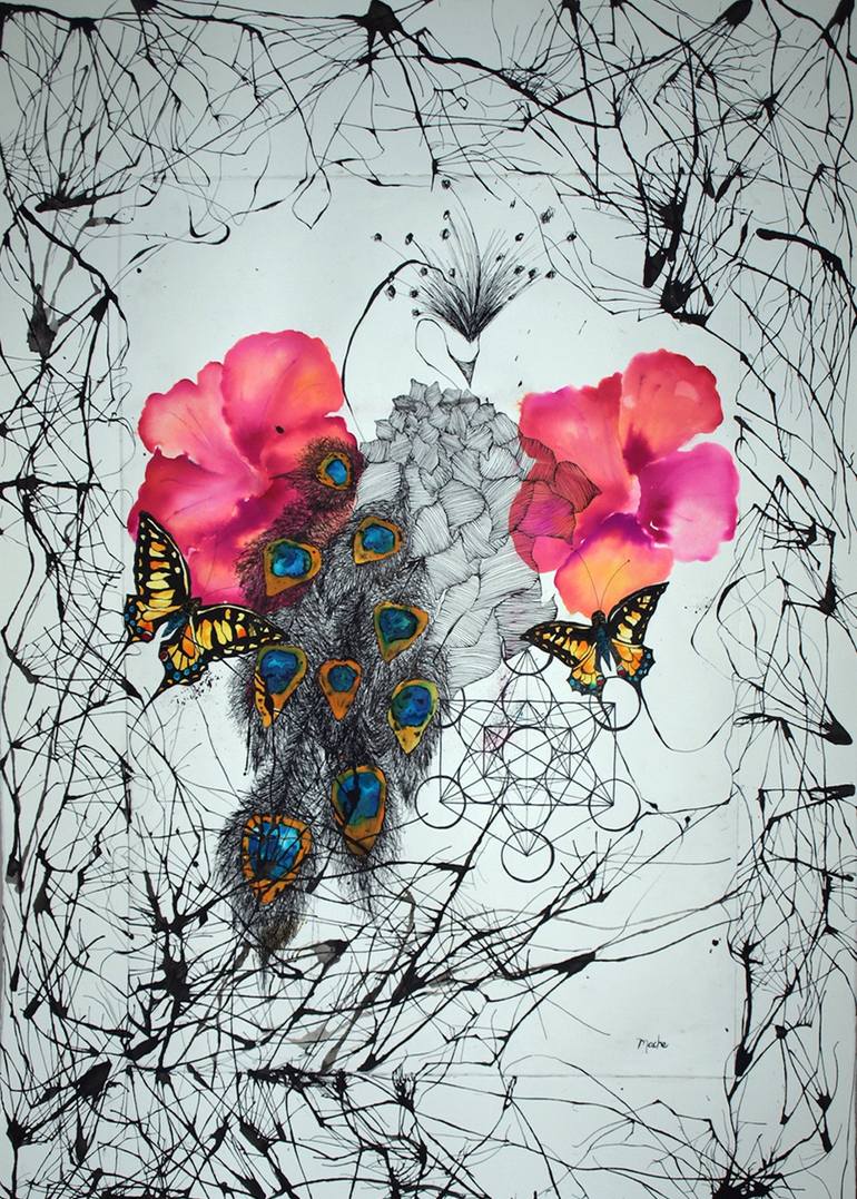 I found a place inside, so tiny, so sacred, I don't have words for it, so I paint it. For me art is a magical method of healing. I try to search for real art, the one that is the highest expression of the spirit. As I create I feel the higher aspects of myself finding their way into the material world, the paper. The geometric shapes that I constantly draw, show the many dimensions of life available . The square represents the physical, the manifest, that which we know. The circle represent the unmanifest, the spirit and space. The triangle symbolises the threefold in nature: manifest, unmanifest and the human being which contains both. When I integrate them I can see life in all the dimensions. The aim of my art is to integrate my self to the point that there's no longer any difference between who I am inside and outside. This art serves as a tool for personal transformation, and I have noticed it aligns and harmonizes spaces where they are displayed. By evoking ancient mexican tribal traditions and rituals, which I have personally experienced, and highly spiritual concepts such as sacred geometry, sacred patterns, the integration of the feminine and masculine, sacred naguals and shamanic figures, I try to become more aware of my own consciousness. Therefore art becomes the highest expression of the spirit.