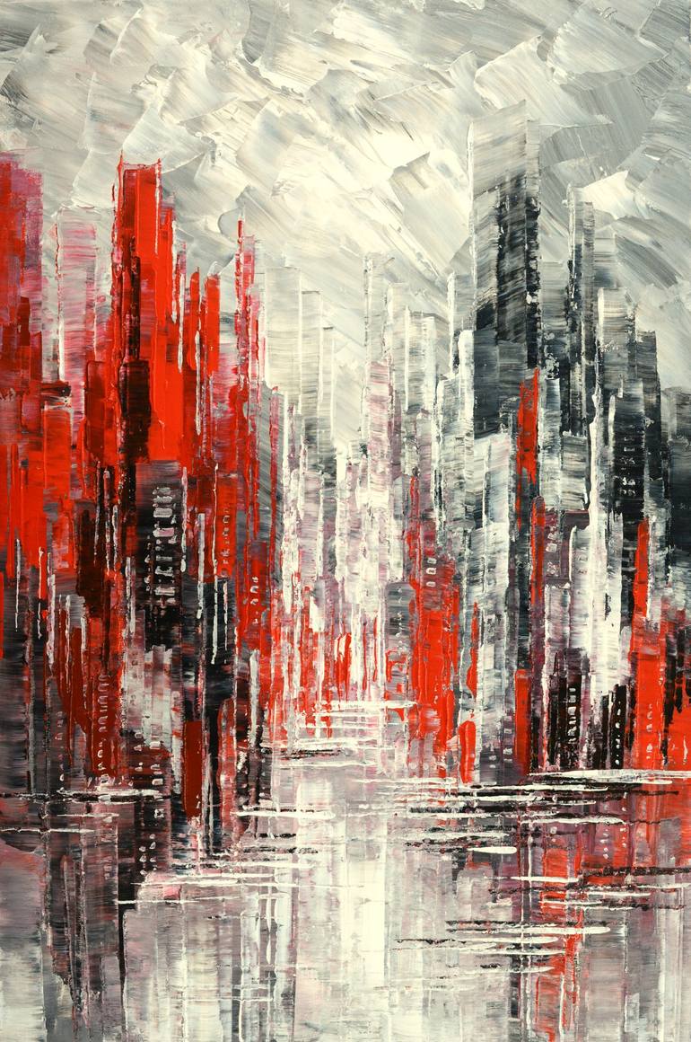 This is an original palette knife cityscape painting. Size: 20" x 30" x 1" The painting is done on gallery wrapped canvas, with no need for framing, as the edges are painted grey. You will receive it "ready to hang", with a wire attached on the back. Protective coat of satin varnish applied. The pai...