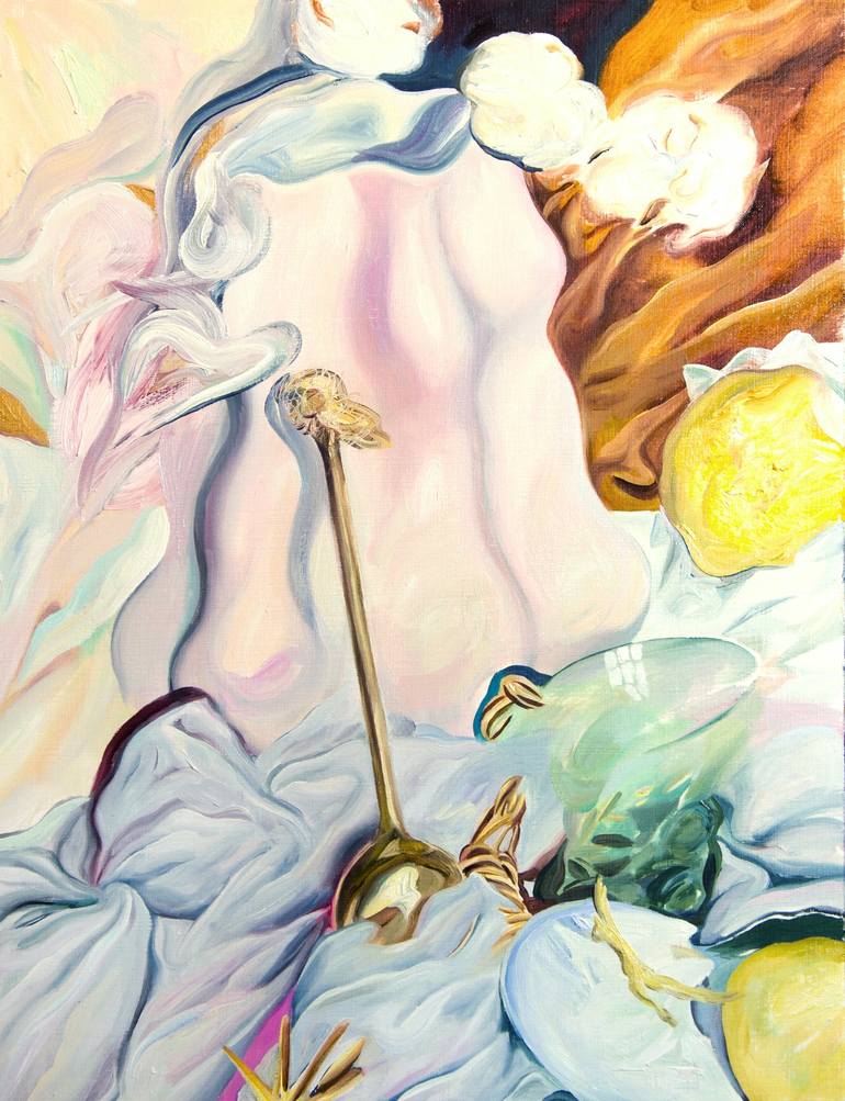 In this still life, I was focusing on the effects of movement, vibration and fluidity of a "still objects". This time I chose a big bizarre vase with a complex curve forme, a goldish spoon, lemons and cottons flowers. I also payed a special attention for a shimmering perl-silver drapery on the foreg...